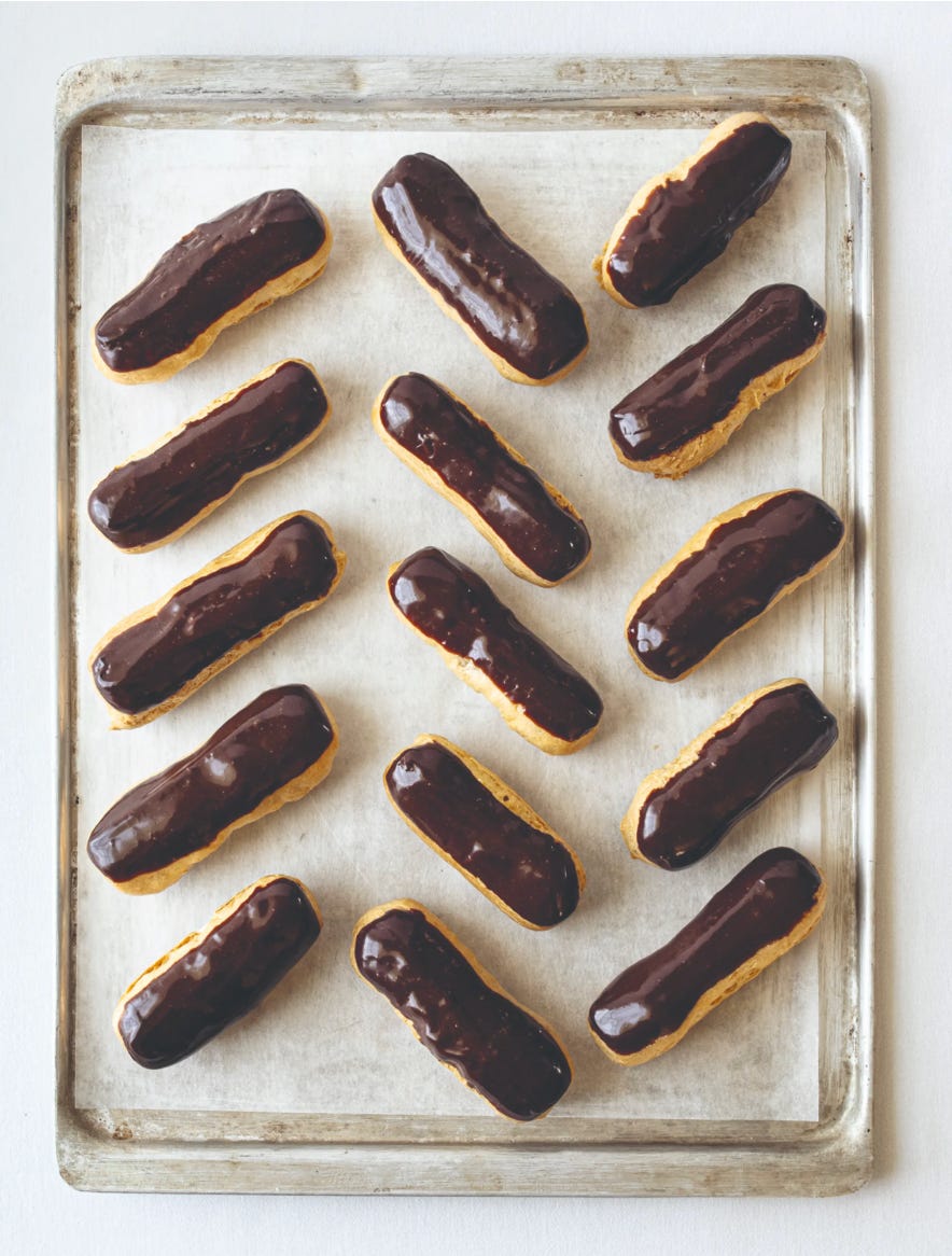 Chocolate éclairs always remind me of the first Sunday I worked in the pastry kitchen at Ballymaloe House. That morning I watched Mamie Hayes, one of the chefs, pipe tray after tray of choux pastry for a busy Sunday lunch. The dough puffed perfectly into the most beautiful éclairs I had ever seen. The moment they cooled, Mamie quickly filled and glazed each pastry, and before I knew it, they had all been sent to the dining room and eaten. For me that is the perfect way to serve éclairs—to eat and enjoy them as soon as they are ready. The pastry should be crisp, the filling should be cold and the glaze should shine.
