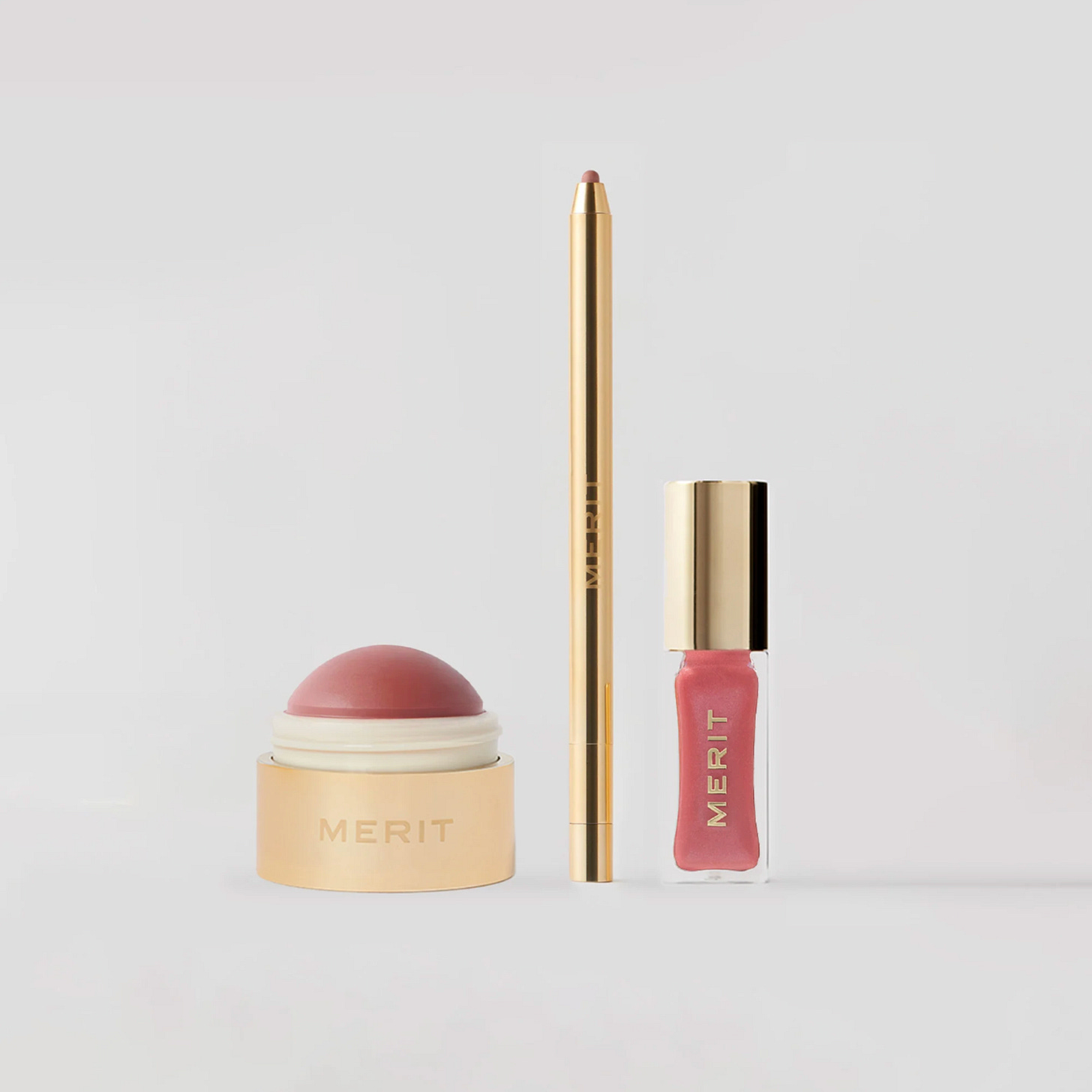 A perfect set from Katherine Power’s Merit: Flush Balm cheek color, Shade Stick tinted lip oil, and Signature Lip Liner. Bonus, you choose the colors.