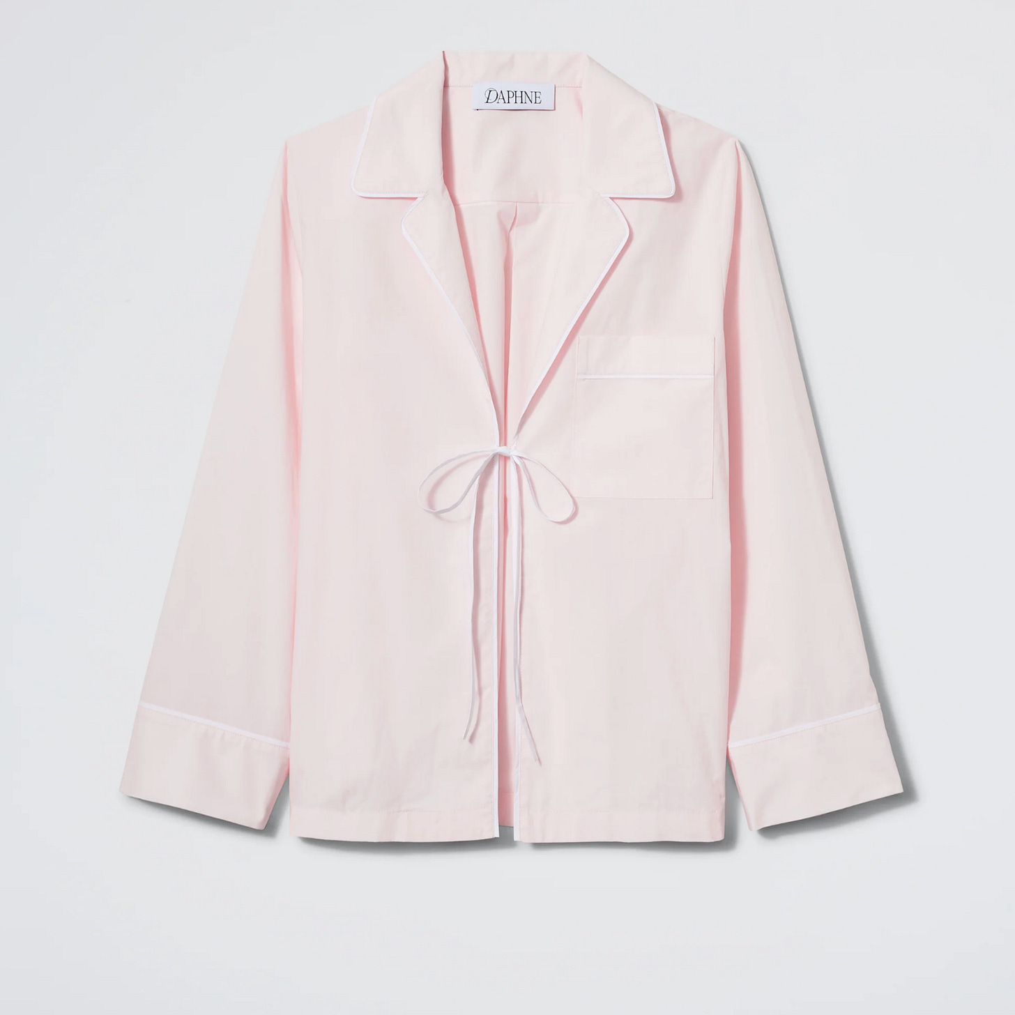 A sexy self-tie pajama top in pale pink cotton poplin from Paige DeSorbo’s ready-to-lounge line.